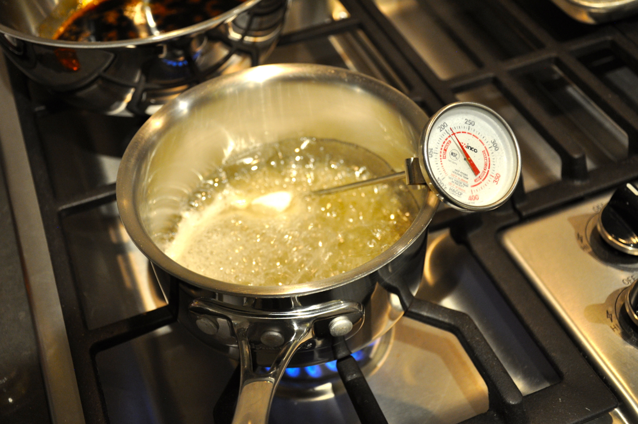 First we get those ingredients boiling together. This time I used a smaller pot and still tried out the out the candy thermometer to see if it was a problem with the pot.