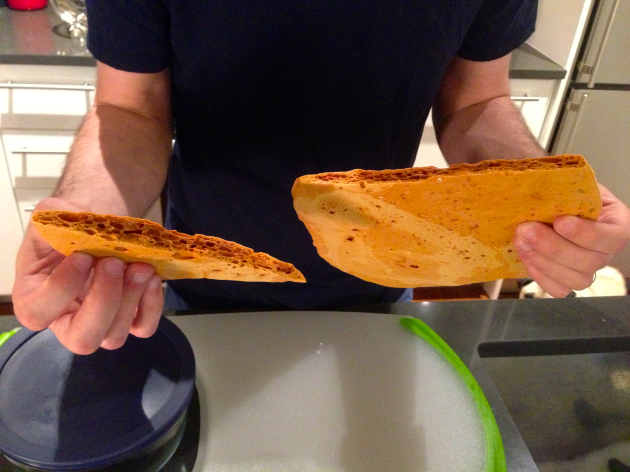 I’ve seen a bunch of recipes online, some call for golden syrup, light corn syrup, dark corn syrup. The one I used only called for honey, water and sugar. It might be worth experimenting with those other recipes but at least with this recipe you don’t need to rush out to buy anything you wouldn’t ordinarily have on hand. So long as you have some sugar and honey lying around, you’re good to go. If you need honeycomb as a key ingredient for a recipe and are a little wary of chemistry in the kitchen I’d recommend going with the crunchie bar options. But if you want to be brave, try something new and have a little spare time up your sleeve (for likely failure, regroup and second attempt) then go for it. Try making honeycomb for yourself. It’s kind of fun.