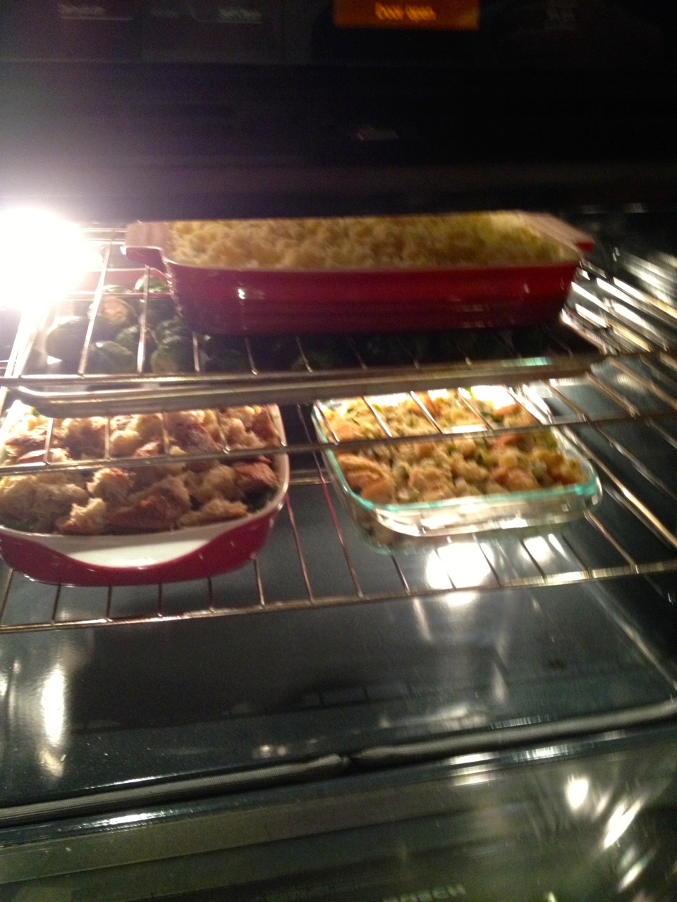 As soon as the turkey came out and began resting I cranked the temperature up to 400 degrees and popped all bakeable dishes into the oven at once and baked until they were all ready (30-40 minutes total). A risky venture but everything fit and came out when ready while we pondered carving.