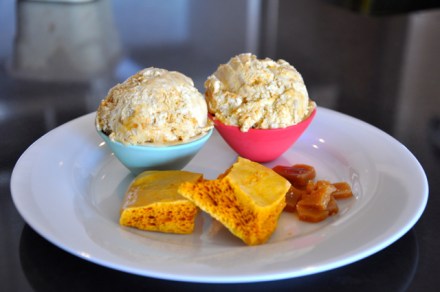 Summer is on its way out so the need for cool desserts has begun to subside. Alas, it’s time to bid adieu to the ice cream maker attachment for a year. But a challenge was set by my husband two days ago. “Replicate hokey pokey ice cream” was the request. What the heck is hokey pokey ice cream? Well it depends on who you ask. If you ask my husband he will say that it’s vanilla ice cream with chewy toffee bits spread throughout the mixture. If you ask ANYONE ELSE ON THIS PLANET they will tell you it’s vanilla ice cream with hokey pokey aka honeycomb candy spread throughout. I found countless recipes online talking about preparing honeycomb and mixing it throughout vanilla ice cream. Ok, I might not be telling the full story here. There is this one product on the market in Australia that happens to be called hokey pokey ice cream which does reference toffee bits. Streets describes the flavor as “Creamy vanilla and honeycomb swirled with reduced fat ice cream with crunchy toffee bits. Made with wholesome dairy milk and a smile in every spoonful”. Ok, challenge set, no specific recipes with toffee bits around so it was time to get creative.