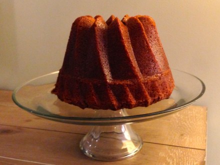2. I used a 9″ Kugelhopf Pan to make my cake with lots of baking spray but no parchment paper.