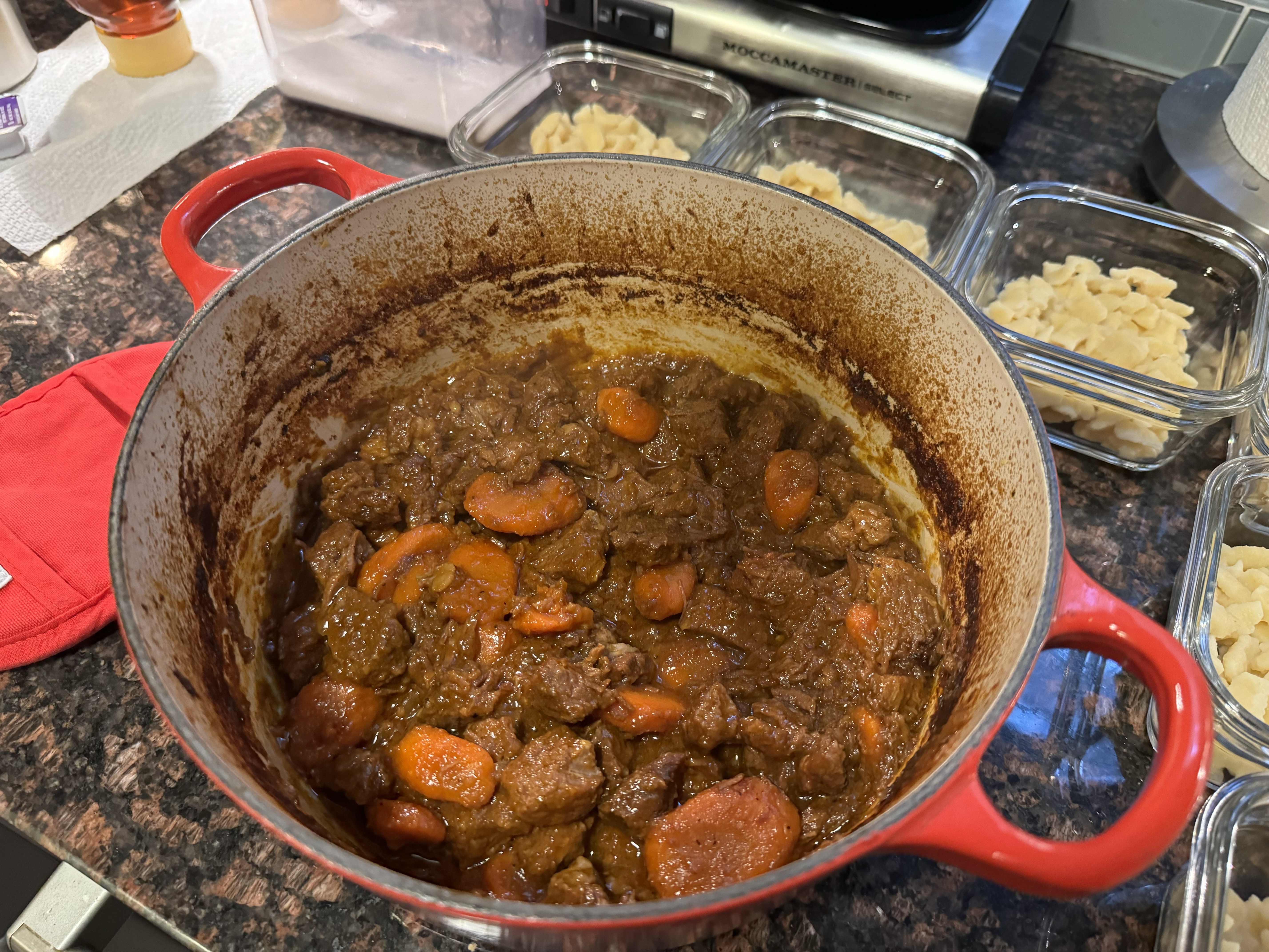• 1.5 lbs chuck roast meat diced into 1 inch cubes (a little less is fine, whatever butcher recommends for slow cook roast meat)